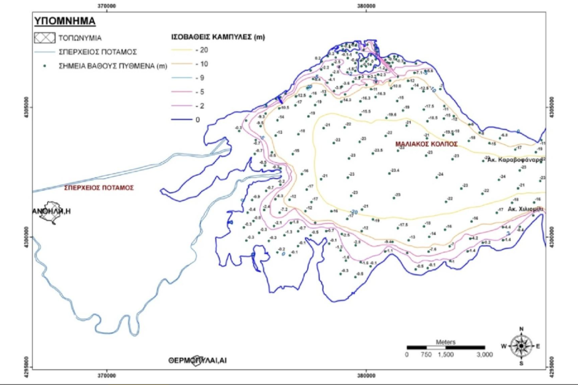 Χάρτης ισοβαθών καμπυλών και σημείων βάθους πυθμένα στην παράκτια περιοχή του Μαλιακού κόλπου.