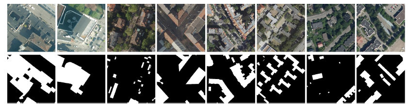 Εικόνα 2: Παράδειγματα δεδομένων στεγών στην βάση GreenRoof. Η πρώτη σειρά αναφέρεται σε εικόνες τηλεπισκόπησης, ενώ η δεύτερη δημιουργεί "μάσκες" για τον προσδιορισμό της προοπτικής για πράσινες στέγες