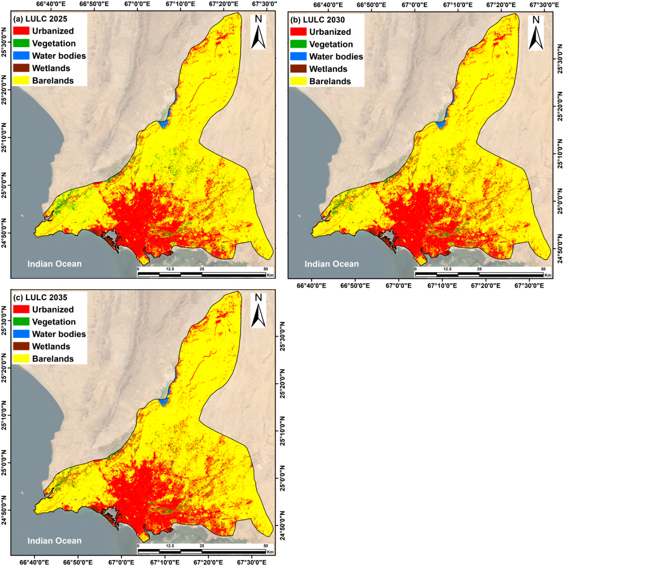 5. Οι προγνωστικοί χάρτες LULC για (a) το 2025, (b) το 2030 και (c) το 2035 αποκαλύπτουν μια αξιοσημείωτη αύξηση στα εικονοστοιχεία της αστικής κατηγορίας, ενώ εκείνα που σχετίζονται με τις κατηγορίες νερού και βλάστησης παρουσιάζουν μείωση, υποδηλώνοντας μετατροπή σε αστική χρήση γης.