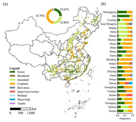 Fig 2. Land use patterns of 63,055 wind turbines. (a) The land use type for each wind turbine and the corresponding proportions (circular chart). (b) Interprovincial variations in land use by wind turbines.