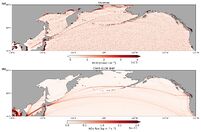 Εικόνα 5. Εντοπισμός μη καταγεγραμμένης ναυτιλιακής δραστηριότητας στη Βερίγγειο Θάλασσα: Ο TROPOMI (a) ανιχνεύει ένα σαφές ίχνος NO2 το οποίο απουσιάζει από τον χάρτη πυκνότητας του CAMS-GLOB-SHIP που βασίζεται στο AIS (b), υποδηλώνοντας την παρουσία πλοίων με απενεργοποιημένο σύστημα εντοπισμού.