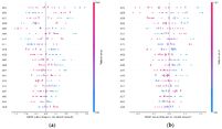 Οι στήλες 'No. Train' και 'No. Test' του Πίνακα 1 αντιστοιχούν στο πλήθος των ετήσιων δειγμάτων που χρησιμοποιήθηκαν για την εκπαίδευση και την αξιολόγηση αντίστοιχα. Τα σημεία για το NO2 και το SO2 συγκεντρώνονται πολύ κοντά στη διαγώνιο (R2 ≈0.71), αποδεικνύοντας την υψηλή προγνωστική ικανότητα του μοντέλου, ενώ τα CO και PM2.5 εμφάνισαν μέτρια συσχέτιση. Αντιθέτως, αξιοσημείωτη είναι η απουσία του Όζοντος (O3) από τις απεικονίσεις, καθώς το μοντέλο απέτυχε πλήρως στην πρόβλεψή του (R2 ≈ 0), γεγονός που επιβεβαιώνει τη δυσκολία εκτίμησης του συγκεκριμένου δευτερογενούς ρύπου σε ετήσια βάση. Για την ερμηνεία του βέλτιστου μοντέλου, η ανάλυση SHAP είναι καθοριστική. Στο διάγραμμα, η οριζόντια θέση κάθε τελείας υποδεικνύει την επίδραση στην πρόβλεψη (δεξιά αύξηση, αριστερά μείωση) και το χρώμα την τιμή του χαρακτηριστικού (κόκκινο υψηλή, μπλε χαμηλή). Παρατηρείται ότι οι υψηλές τιμές σε συγκεκριμένα κανάλια (κόκκινες τελείες δεξιά) αυξάνουν την προβλεπόμενη ρύπανση, υποδηλώνοντας ότι το μοντέλο αναγνωρίζει δορυφορικά σήματα πυκνής δόμησης ή ασφάλτου. Αντιθέτως, χαμηλές τιμές (μπλε τελείες, πιθανώς βλάστηση) μειώνουν την πρόβλεψη, επιβεβαιώνοντας τη φυσική σημασία των δεδομένων. Πρακτικά, η ανάλυση αυτή αποκαλύπτει ότι μεγάλο μέρος της πληροφορίας είναι πλεονάζον, επιτρέποντας την ανάπτυξη απλούστερων μοντέλων στο μέλλον.
