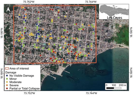 Μετά τον σεισμό, η ομάδα StEER/GHI συγκέντρωσε 11.669 καταγραφές κτιρίων, εκ των οποίων 215 στο Les Cayes, με στοιχεία τύπου δόμησης και πέντε βαθμίδες ζημιάς, ενώ η εικόνα Capella SAR άριστης ανάλυσης (0,5 μ.) της 16/8/2021 τροφοδότησε την ανάλυση. Αντίστοιχα για τις κατολισθήσεις, χρησιμοποιήθηκαν προ - και μετασεισμικά δεδομένα Sentinel-2 για την οπτική χαρτογράφηση, και δεδομένα Sentinel-1 GRD VH εντός ±7 ημερών, τα οποία παρείχαν την αναλογία έντασης backscatter.