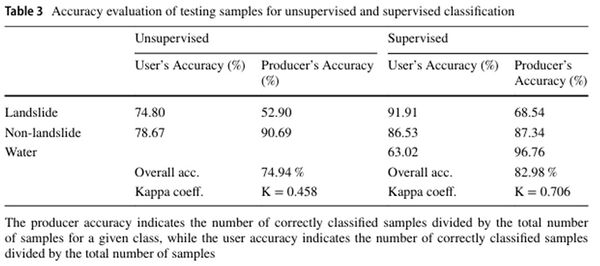 Η χειροκίνητη οπτική χαρτογράφηση με Sentinel-2 αποτύπωσε 477 κατολισθήσεις σε έκταση 15,9 km² ενώ μεγάλο τμήμα έμεινε αχαρτογράφητο λόγω νέφωσης. Οι χάρτες μεταβολής NDVI και BI επέτρεψαν οπτικό εντοπισμό, αλλά η αβέβαιη ταξινόμηση δεν ξεχώριζε επαρκώς τις κατολισθήσεις από σύννεφα ή άλλα στοιχεία.Για υπερνίκηση του προβλήματος, υπολογίστηκε εικόνα αναλογίας έντασης I ratio από κανάλια Sentinel-1 GRD VH. Η αβέβαιη ταξινόμηση EM απομόνωνε γενικά τις κατολισθήσεις, αλλά συχνά ταύτιζε πλημμυρισμένες εκτάσεις με κατολισθήσεις. Με επιβλεπόμενη Random Forest (150 δέντρα) σε 14 χαρακτηριστικά (12 SAR + SRTM κλίση/απήχηση) και 41.553 δείγματα (70 % εκπαίδευση, 30 % έλεγχος) επιτεύχθηκε ακρίβεια 83 %, με 92 % επιτυχία στον εντοπισμό κατολισθήσεων και σαφή διαχωρισμό πλημμυρικών νερών. Το φίλτρο Sieve αφαίρεσε μικρά πολύγωνα θορύβου. Συνεπώς, ακολουθώντας σενάρια συνδυασμένου σεισμού-πλημμύρας, η επιβλεπόμενη ταξινόμηση δεδομένων SAR που υπολογίζονται γρήγορα σε cloud πλατφόρμες, προσφέρει σημαντικά καλύτερη ακρίβεια και αξιοπιστία για τη δημιουργία πολυχρονικών απογραφών κατολισθήσεων.