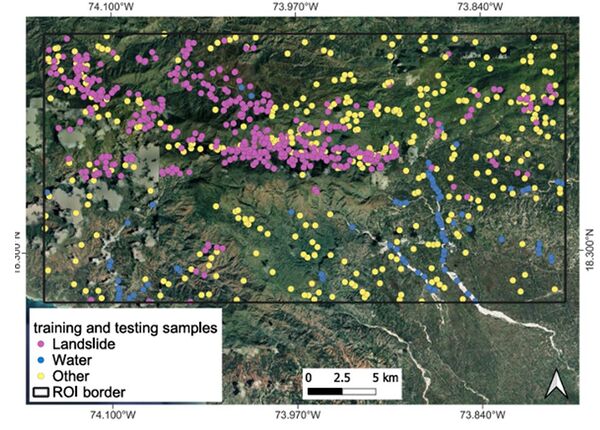 Αντίστοιχα για τις κατολισθήσεις, χρησιμοποιήθηκαν προ - και μετασεισμικά δεδομένα Sentinel-2 για την οπτική χαρτογράφηση, και δεδομένα Sentinel-1 GRD VH εντός ±7 ημερών, τα οποία παρείχαν την αναλογία έντασης backscatter.