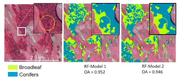[[Αρχείο:2forest.png|thumb|right|'''Εικόνα''':Χάρτες πλατυφύλλων (πράσινο) και κωνοφόρων (μπλε) δασικών εκτάσεων με το CIR ορθοφωτοχάρτη στο υπόβαθρο για μεικτά δάση στην Ελβετία. Παρότι δύο διαφορετικές προσεγγίσεις μοντελοποίησης Random Forest (RF) παράγουν σχεδόν ταυτόσημες συνολικές ακρίβειες (OA), η κατανομή των εικονοστοιχείων πλατυφύλλων και κωνοφόρων