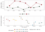 Εικόνα: Στο πάνω μέρος παρουσιάζεται η διάμεσος RMSE σε σχέση με τους δύο δείκτες βλάστησης NDVI και EVI2. Η διάμεσος υπολογίζεται από τα αποτελέσματα όλων των τεσσάρων μεθόδων. Στο κάτω μέρος παρουσιάζεται η τυπική απόκλιση για κάθε έτος των φαινολογικών μετρήσεων (LSP metrics) που εξήχθησαν με τη μέθοδο AG και Beck.