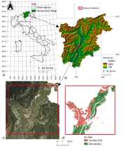 Εικόνα: Κατανομή της περιοχής μελέτης σε εθνικό (α) και περιφερειακό επίπεδο (β). Ορθοφωτογραφία υψηλής ανάλυσης (γ, κάτω δεξιά) και χάρτης χωρικής κατανομής των Εδαφικών Ομάδων Υποστρώματος (δ, αριστερά). Το κόκκινο πλαίσιο υποδεικνύει την περιοχή ενδιαφέροντος. (Για την ερμηνεία των χρωμάτων, βλ. ηλεκτρονική έκδοση του άρθρου.)