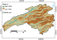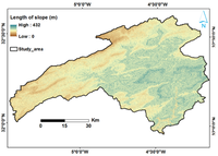 3. Μήκος κλίσης (LS – Length of Slope): Ο συγκεκριμένος δείκτης προκύπτει από το ψηφιακό μοντέλο εδάφους μέσα από το λογισμικό του ArcGIS και ακολουθώντας τον τύπο των Wischmeier και Smith: LS = ((L/22)^m)×(65.41〖sin〗^2 (S)+4.56sin(S)+0.065) όπου: