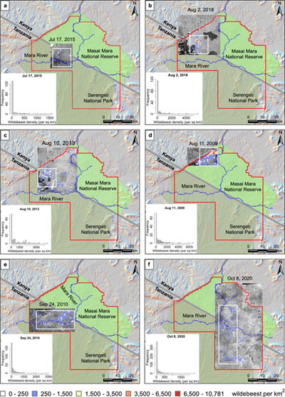 Το εκπαιδευμένο πλέον, αθροιστικό U-Net base μοντέλο εφαρμόστηκε για ανίχνευση γκνου στο σύνολο των δεδομένων. Τα αποτελέσματα έδειξαν αξιοποιστία σε αλλαγές 1) μεταξύ διαφορετικών δορυφορικών αισθητήρων σε 6 χρονικές περιόδους, 2) στο υπόβαθρο του τοπίου με σύγχυση μόνο με φωλιές τερμιτών, μικρούς θάμνους και σκίες από το έδαφος και 3) στα ποικίλα μοτίβα συνάθροισης των γκνου (διάσπαρτα, σε γραμμές ή σε ομάδες) . Η συνολική καταμέτρηση ανέδειξε 480.362 γκνου με F1-score: 84.75 ± 0.18%. Ανάλυση της χωρικής κατανομής έδειξε ότι η πυκνότητα των γκνου ποικίλλει σημαντικά κατά την ξηρή περίοδο (Ιούλιος-Οκτώβριος), με κορυφώσεις τον Αύγουστο στο δυτικό μέρος του εθνικού κατφυγίου Masai Mara (>4.000-6.000 άτομα/τ.χλμ.) και χαμηλές συγκεντρώσεις τον Ιούλιο και τον Οκτώβριο (~1.500-2.000 άτομα/τ.χλμ). Τα πρότυπα κατανομής συμφωνούν με τις γνωστές μεταναστευτικές κινήσεις: τα ζώα κινούνται βόρεια προς το "Τρίγωνο Μάρα" τον Ιούλιο-Αύγουστο και εξαπλώνονται νότια στο Σερενγκέτι τον Οκτώβριο.