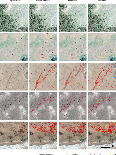 Το μοντέλο εφαρμόστηκε σε εικόνες έξι ετών (2009-2020) που καλύπτουν 2.747 τ.χλμ., με χρήση δορυφορικών αισθητήρων με ικανότητα χωρικής ανάλυση 38-50 cm GeoEye-1 (GE01), WorldView-2(WV02) και WorldView-3 (WV03). Το σύνολο δεδομένων εκπαίδευσης περιελάμβανε 53.906 χειροκίνητα επισημασμένα γκνου σε 1097 patches που αντιπροσώπευαν διάφορες περιβαλλοντικές συνθήκες, κάθε γκνου αντιστοιχούσε σε 3-4 εικονοστοιχεία σε μήκος και 1-3 σε πλάτος. | Το μοντέλο εφαρμόστηκε σε εικόνες έξι ετών (2009-2020) που καλύπτουν 2.747 τ.χλμ., με χρήση δορυφορικών αισθητήρων με ικανότητα χωρικής ανάλυση 38-50 cm GeoEye-1 (GE01), WorldView-2(WV02) και WorldView-3 (WV03). Το σύνολο δεδομένων εκπαίδευσης περιελάμβανε 53.906 χειροκίνητα επισημασμένα γκνου σε 1097 patches που αντιπροσώπευαν διάφορες περιβαλλοντικές συνθήκες, κάθε γκνου αντιστοιχούσε σε 3-4 εικονοστοιχεία σε μήκος και 1-3 σε πλάτος. | ||