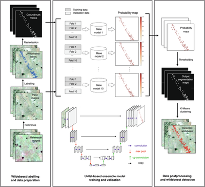 Η ροή εργασίας της μελέτης μετατρέπει το δίκτυο U-Net από εργαλείο κατάτμησης εικόνας σε σύστημα ανίχνευσης μεμονωμένων ζώων μέσω δορυφόρου. Η διαδικασία ξεκινά με την κατάτμηση των δορυφορικών εικόνων σε μικρότερα τμήματα (patches 336 x 336 pixel) και τη δημιουργία δυαδικών μασκών όπου τα γκνου επισημαίνονται ως ομάδες εικονοστοιχείων. Στη συνέχεια, το μοντέλο U-Net αναλύει αυτά τα δεδομένα χρησιμοποιώντας μια συμμετρική δομή κωδικοποιητή-αποκωδικοποιητή για την εξαγωγή χαρακτηριστικών και τον ακριβή εντοπισμό τους. Για τη διασφάλιση της αξιοπιστίας των αποτελεσμάτων εφαρμόζεται ομαδική μάθηση με δέκα διαφορετικά μοντέλα μέσω της μεθόδου K-fold. Στο τελικό στάδιο της μετα-επεξεργασίας χρησιμοποιείται ο αλγόριθμος ομαδοποίησης K-means, ο οποίος διαχωρίζει τις συστάδες εικονοστοιχείων σε διακριτές οντότητες. Αυτή η προσέγγιση επιτρέπει τη μετάβαση από την απλή πρόβλεψη πιθανότητας στην ακριβή καταμέτρηση και αξιολόγηση των ζώων σε επίπεδο ατόμου, προσφέροντας μια αποτελεσματική λύση για την παρακολούθηση μεγάλων μεταναστευτικών πληθυσμών από το διάστημα.