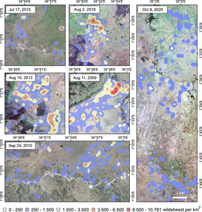 Αφού το μοντέλο έδωσε υψηλή ακρίβεια εφαρμόστηκε σε ολόκληρο το σύνολο των δορυφορικών εικόνων. Οι προβλέψεις πιθανότητας του αθροιστικού μοντέλου μετατράπηκαν σε μεμονωμένα σημεία μέσω K-means clustering για την εκτίμηση του πληθυσμού. Για τα χωρικά μοτίβα μετανάστευσης σε διαφορετικές ημερομηνίες, δημιουργήθηκαν χάρτες πυκνότητας σημείων (point density maps) με μήκος κελιού 100 m ακτίνα 500 μέτρων. Αυτοί οι χάρτες, σε συνδυασμό με ιστογράμματα συχνότητας, οπτικοποίησαν πώς οι συναθροίσεις των γκνου αλλάζουν χωρικά και χρονικά, προσφέροντας μια λεπτομερή εικόνα της κατανομής τους στο οικοσύστημα Σερενγκέτι-Μάρα.