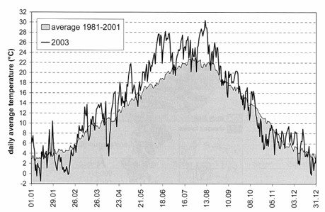 Εικόνα 3. Μέσες ημερήσιες θερμοκρασίες στον μετεωρολογικό σταθμό του Locarno-Monti το 2003 και μέσες τιμές της περιόδου 1981–2008