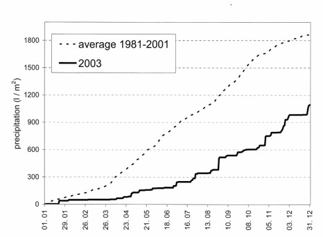 Εικόνα 2. Συσσωρευμένες βροχοπτώσεις στον μετεωρολογικό σταθμό του Λοκάρνο-Μόντι το 2003 και μέσες τιμές για την περίοδο 1981-2008 (πηγή: MeteoSwiss)