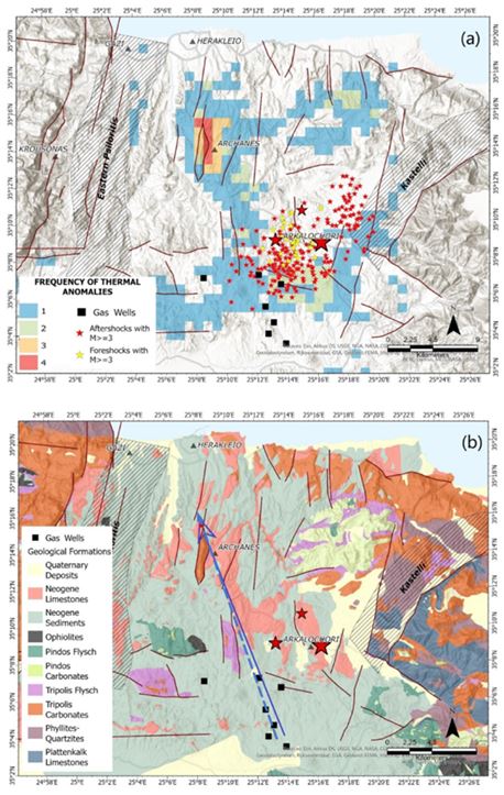 Εικόνα 4 (a) Συχνότητα θερμικών ανωμαλιών (b) ο λιθολογικός χάρτης της περιοχής μελέτης