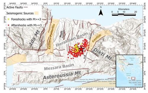 Εικόνα 1 Επίκεντρο του κύριου συμβάντος και των προσεισμών και μετασεισμών(HUSN), τα κύρια ενεργά ρήγματα (Ganas, A., Oikonomou, I. A., & Tsimi, C. (2013)) και τις σεισμογόνες πηγές (Caputo, R., Pavlides, S., 2013)