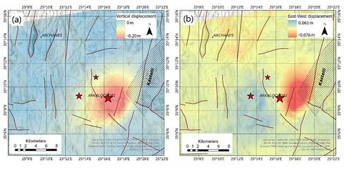 Εικόνα 3 Χάρτες μετατόπισης για: (a) την κατακόρυφη (πάνω-κάτω) και (β) την κατεύθυνση Α-Δ για την Κεντρική Κρήτη λόγω του σεισμού της 27ης Σεπτεμβρίου 2021, με επικάλυψη των ενεργών ρηγμάτων της ευρύτερης περιοχής