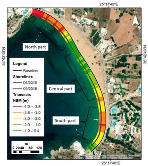 Για την ανάλυση της μετατόπισης της ακτογραμμής αξιοποιήθηκαν στατιστικοί δείκτες διάβρωσης και απόθεσης μέσω του εργαλείου ψηφιακού συστήματος ανάλυσης ακτογραμμής (DSAS), ενώ οι μετρήσεις υψηλής ακρίβειας με DGPS/GNSS επέτρεψαν τον ακριβή προσδιορισμό των εποχικών μεταβολών στις παραλίες αναφοράς.