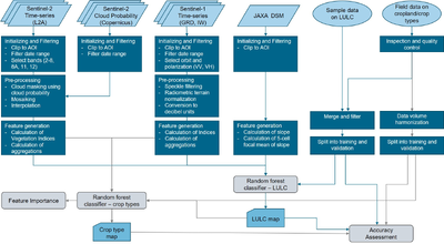 Το σύνολο της προεπεξεργασίας των δεδομένων από τις δορυφορικές λήψεις έως την εισαγωγή τους στα μοντέλα ταξινόμησης (μέσα στο περιβάλλον του Google Earth Engine) περιελάμβανε τα παρακάτω στάδια: